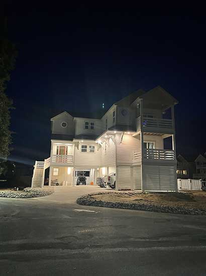 Clean architectural lines, elevated structure, and soft exterior lighting create a refined coastal presence. Large windows enhance curb appeal while showcasing warm interior illumination against the evening sky for a polished, upscale look.
