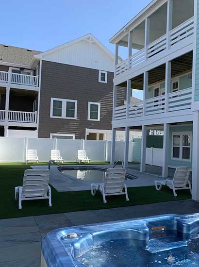 Experience ultimate relaxation in this meticulously maintained backyard featuring a sun-drenched swimming pool and integrated hot tub. The professional landscaping and premium synthetic turf offer a low-maintenance, luxury coastal lifestyle.