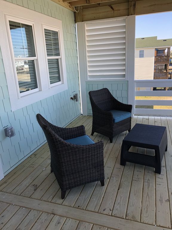 Unwind on a charming covered deck featuring comfortable seating and coastal-inspired design. Perfect for morning coffee or evening relaxation, offering a peaceful outdoor retreat with fresh air and privacy.